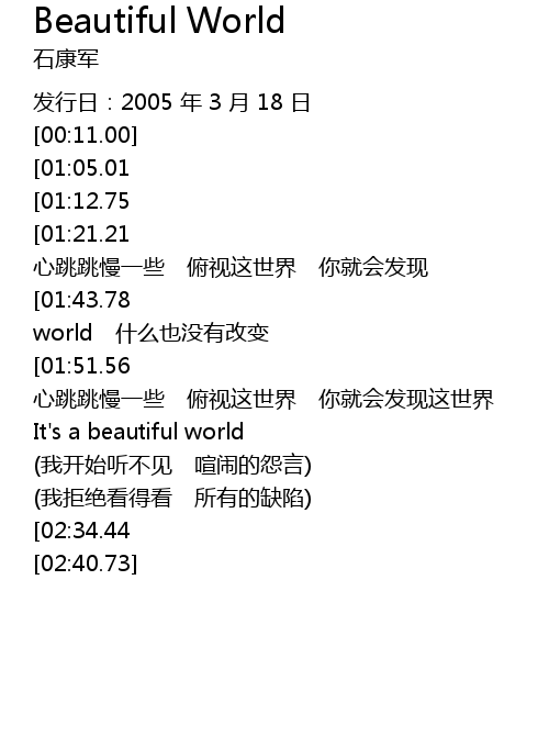 | [00:47.51][01:43.78][02:14.90] | It's such a beautiful world 什么也没有改变 |