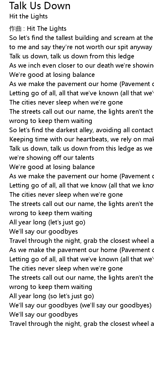 | Talk us down, talk us down from this ledge as we inch even closer to our death we' re showing off our talents | |