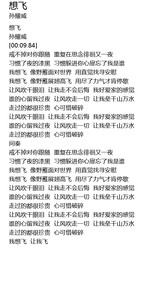 | [02:37.85] | 我想飞 像野雁展翅高飞 用尽了力气才肯停歇 |