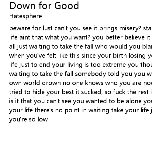 beware for lust can't you see it brings misery? start chasing your dreams get a life aint that what you want? you better believe it you thought about quitting all just waiting to take the fall who would you blame for leaving this earth? when you've felt like this since your birth losing your self-esteem waiting for life just to end your living is too extreme you thought about quitting all just waiting to take the fall somebody told you you were useless that's where your own world drown no one knows who you are now just stay down for good you've tried to hide your best it sucked, so fuck the rest it made no sense to me why is it that you can't see you wanted to be alone you wanted to be left alone take your life there's no point in waiting take your life just get the job done you're so low |