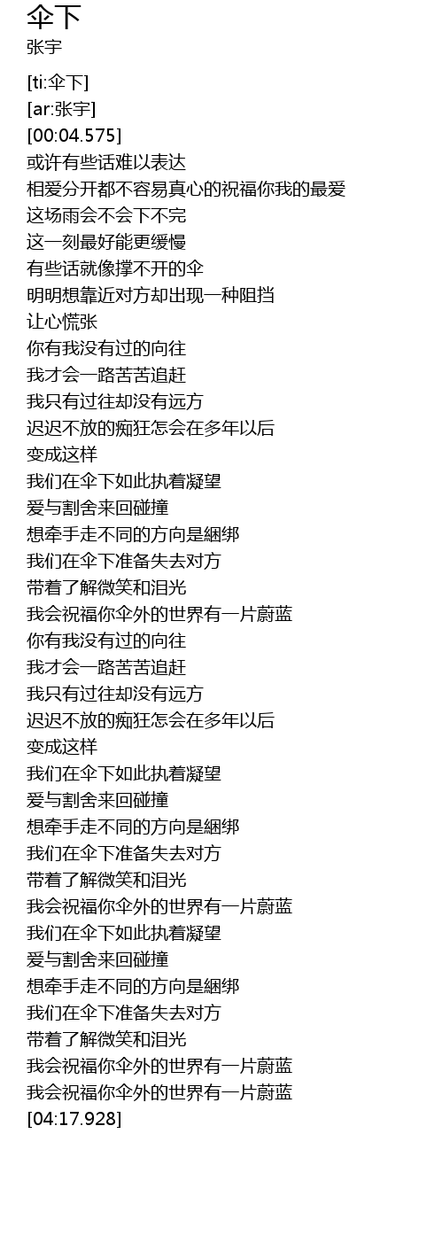 | [03:31.301] | 我们在伞下如此执着凝望 |