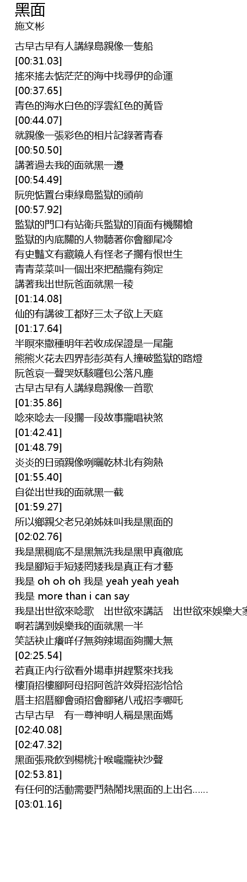 | [02:00.02] | 所以鄉親父老兄弟姊妹叫我是黑面的 |
