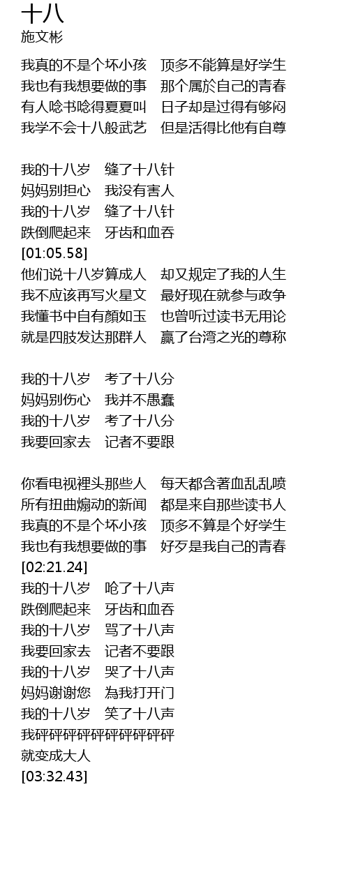 | [00:58.79] | 我的十八岁 缝了十八针 |
