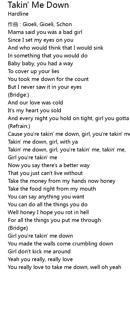 | Cause you' re takin' me down, girl, you' re takin' me, takin' me | |