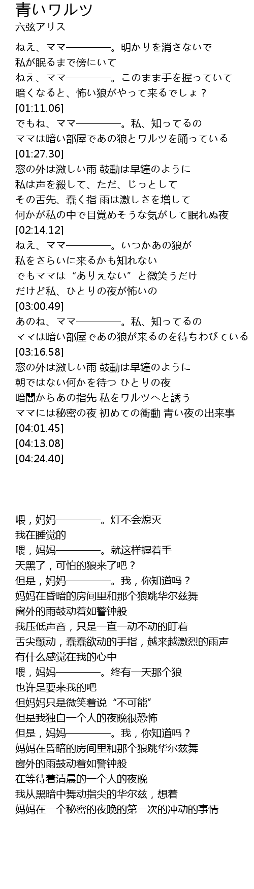 | [03:06.39] | ママは暗い部屋であの狼が来るのを待ちわびている |