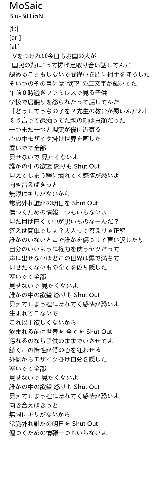| [01:41.70] | cháng shí wài shuí míng rì Shut Out |