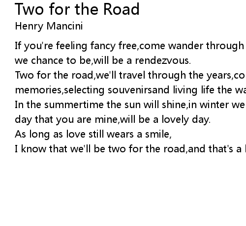 | Two for the road,we'll travel through the years,collecting precious memories,selecting souvenirsand living life the way we please. | |