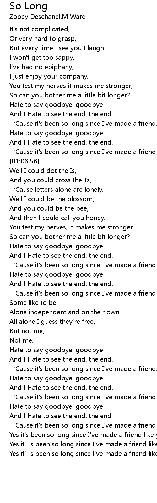 | [00:59.70] | ' Cause it' s been so long since I' ve made a friend like you. |