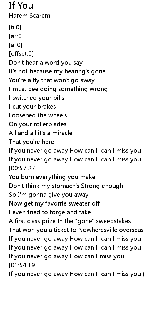 | [02:22.36] | If you never go away How can I can I miss you( x N) |