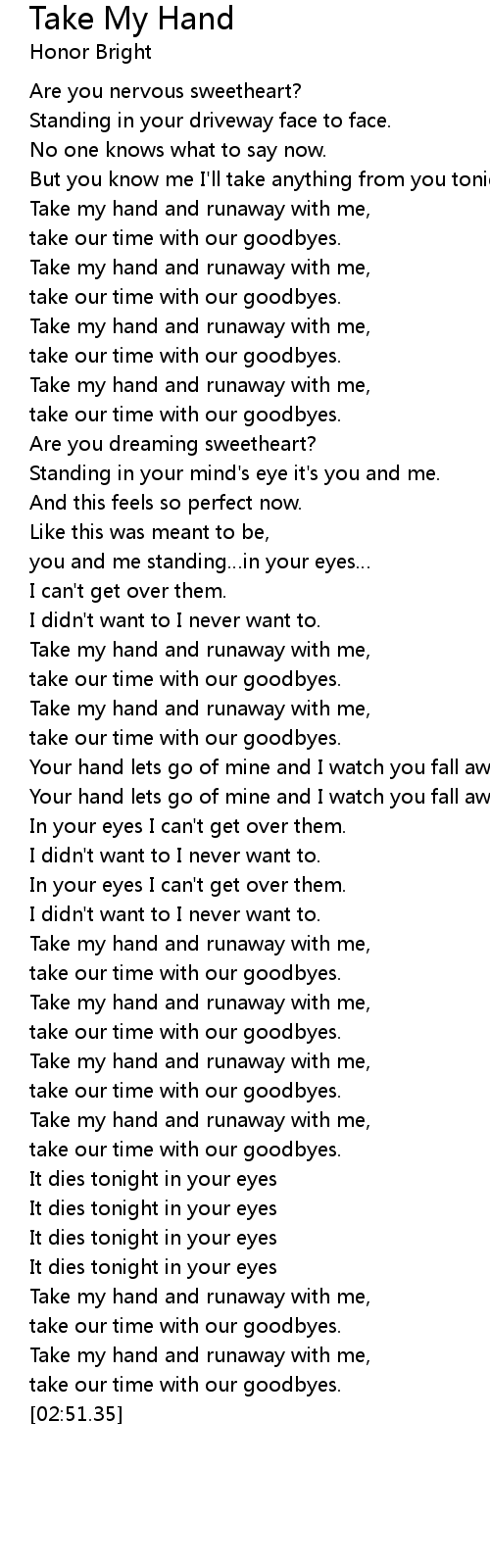 | [01:30.50] | Your hand lets go of mine and I watch you fall away. |