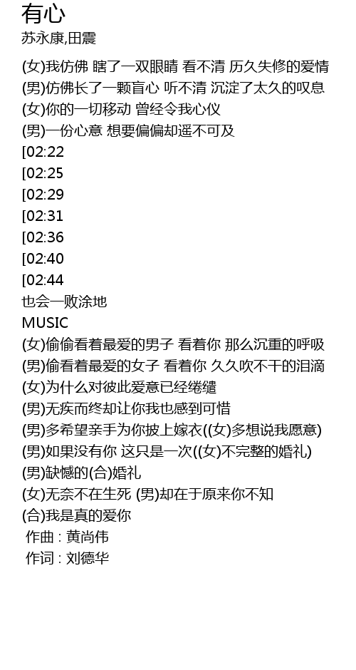 | [02:56] | (男)多希望亲手为你披上嫁衣((女)多想说我愿意) |
