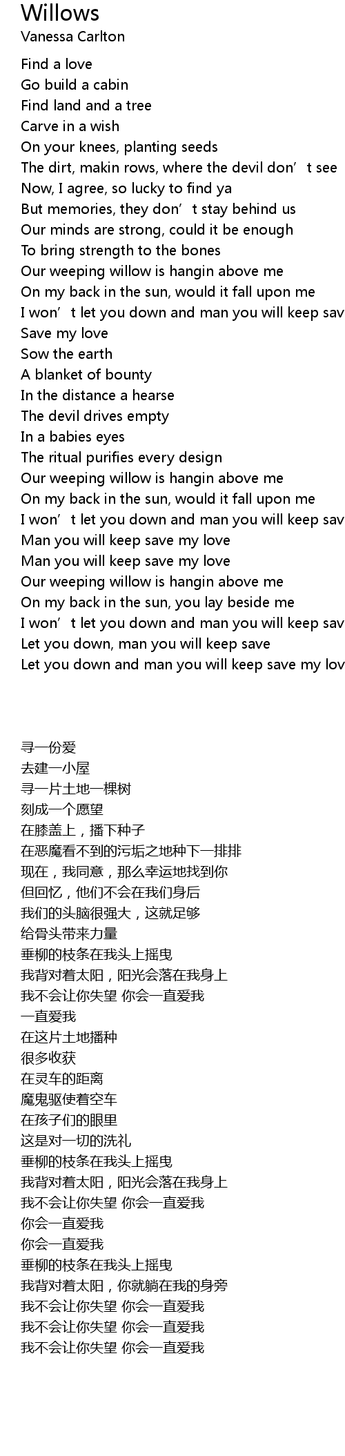 | [02:15.44] | Our weeping willow is hangin above me |