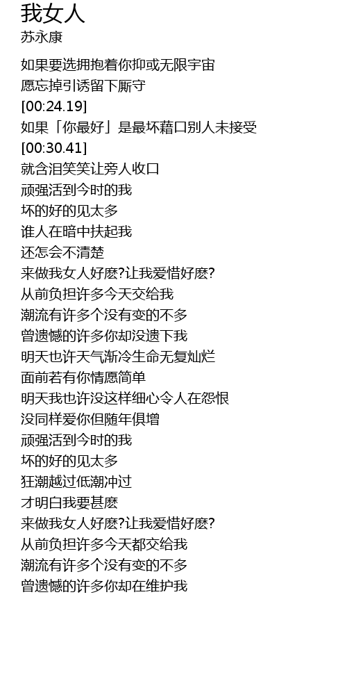 | [02:21.99] | 来做我女人好麽?让我爱惜好麽? |