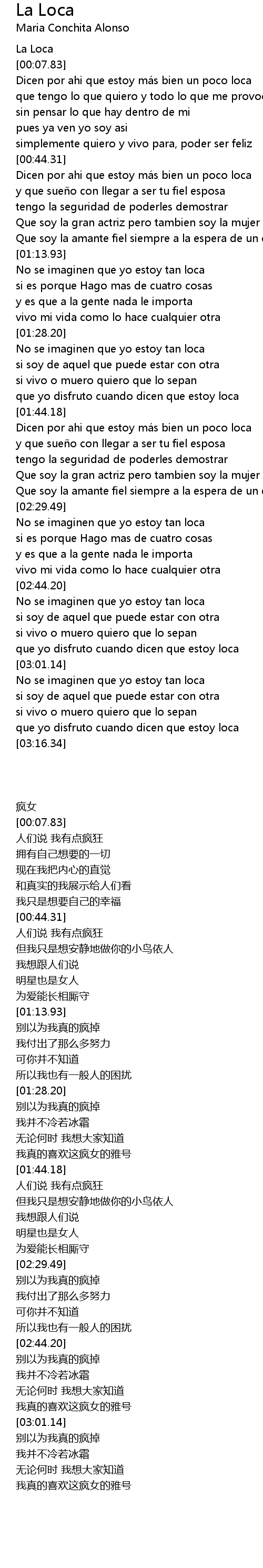 | [02:00.76] | Dicen por ahi que estoy má s bien un poco loca |