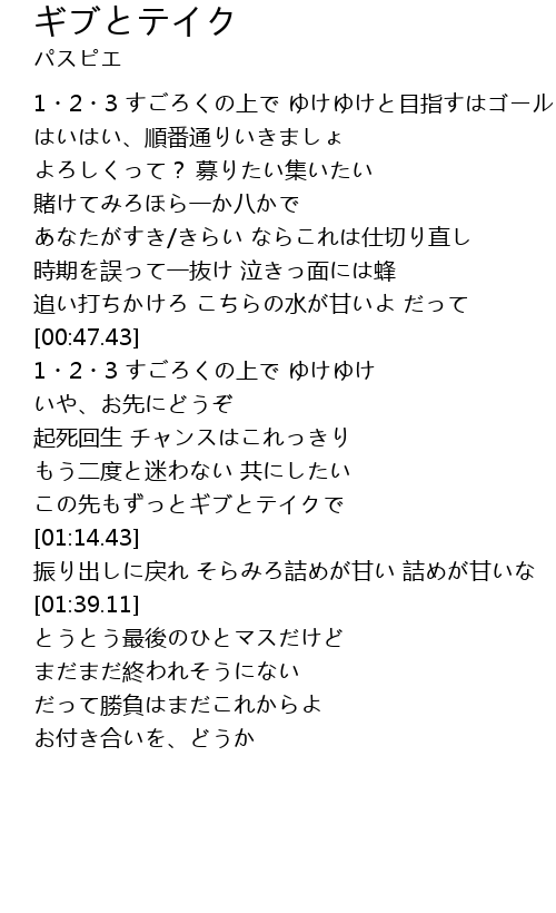 | [00:57.75] | 1・2・3 すごろくの上で ゆけゆけ いや、お先にどうぞ |