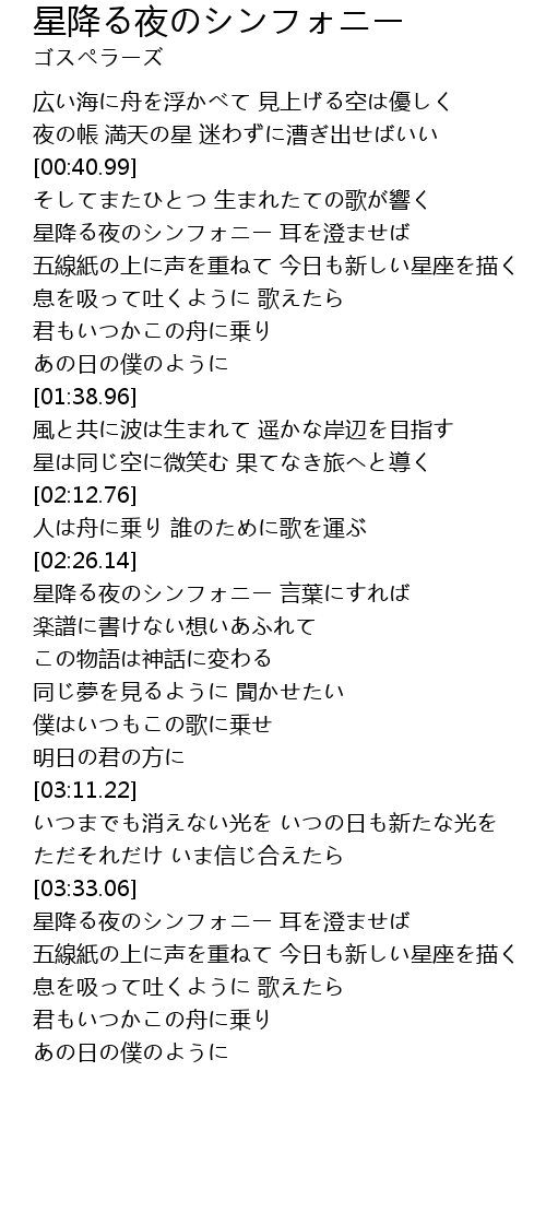 | [03:41.94] | 星降る夜のシンフォニー 耳を澄ませば |