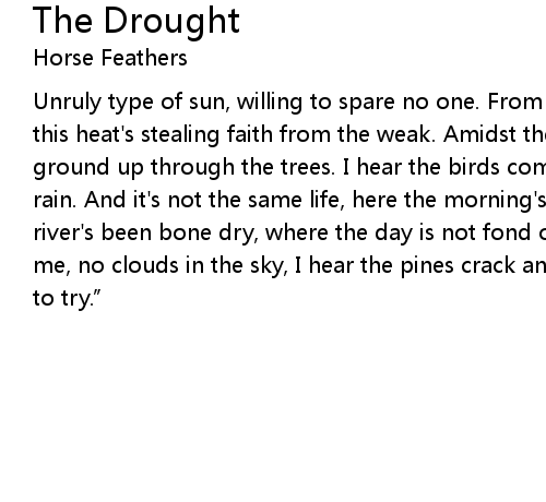 | Unruly type of sun, willing to spare no one. From the plains up to the peaks, this heat's stealing faith from the weak. Amidst the burning breeze, from the ground up through the trees. I hear the birds complain about the lack of the rain. And it's not the same life, here the morning's like a knife, and the river's been bone dry, where the day is not fond of light. It's bearing down on me, no clouds in the sky, I hear the pines crack and cry: “There's no reason to try.” |