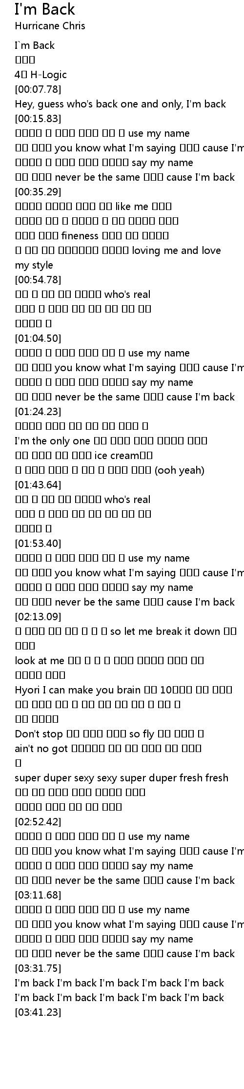 | [00:08.52] | Hey, guess who's back one and only, I'm back |