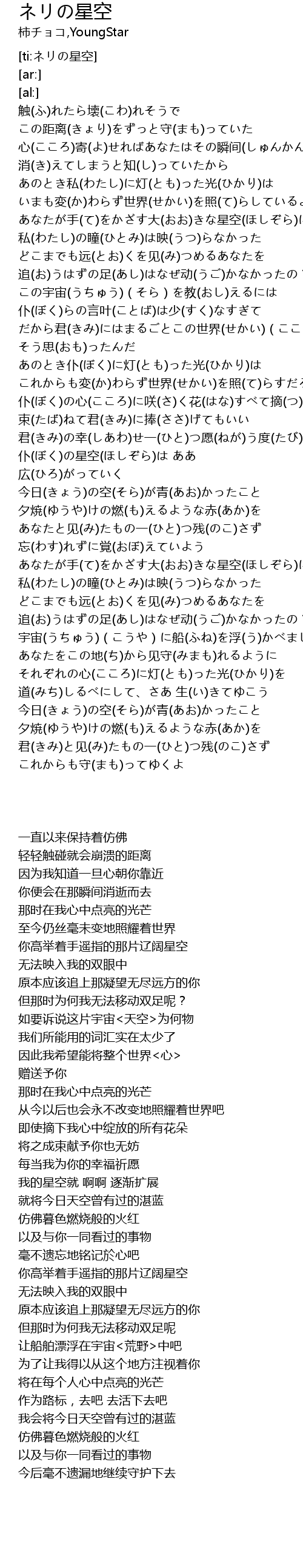 | [02:31.61] | 仆(ぼく)の星空(ほしぞら)は ああ 広(ひろ)がっていく |