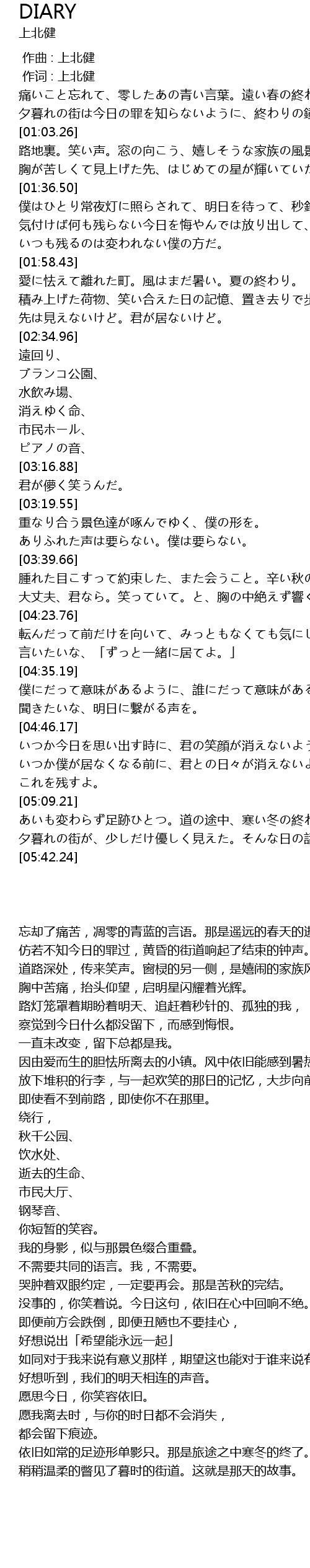 | [05:19.73] | あいも変わらず足跡ひとつ。道の途中、寒い冬の終わり。 |