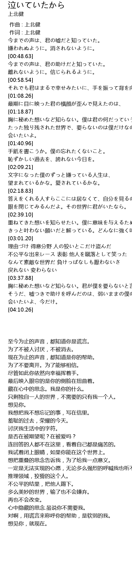 | [03:48.92] | そうだ、嘘つきで助けを呼んだのは、弱いままの僕の方だよ。 |