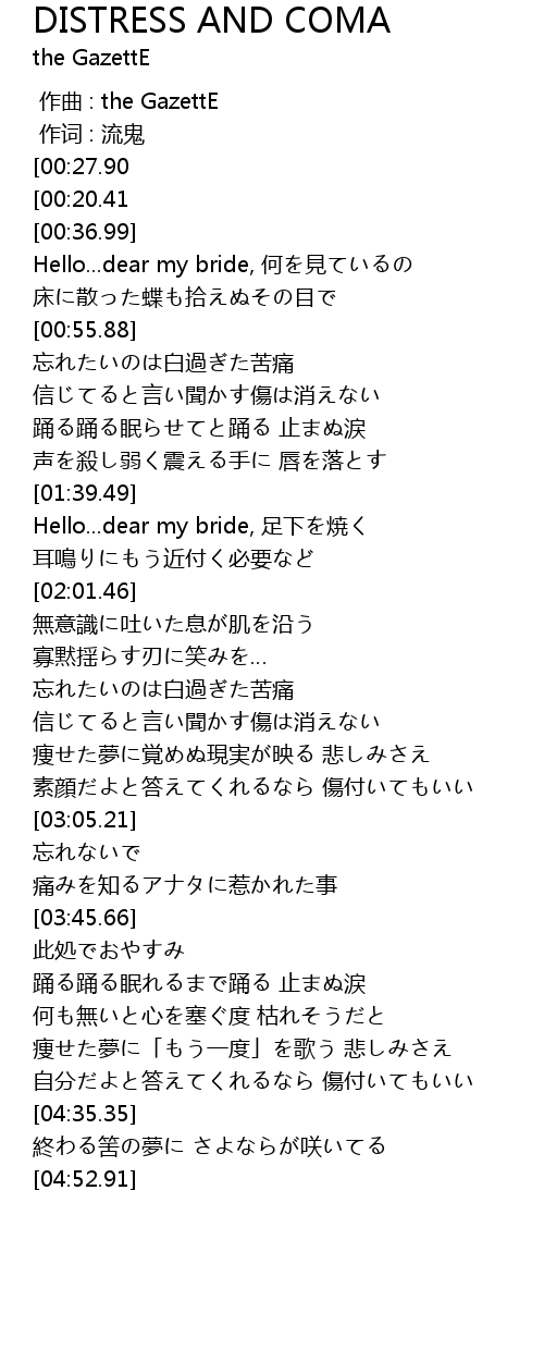 | [00:33.18][00:27.90][00:22.94][00:17.78] | Until your distress sleeps... |