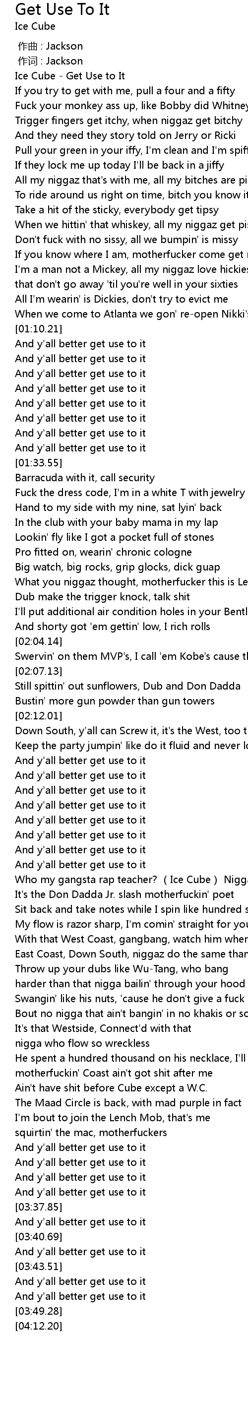 | [00:00.92] | Ice Cube - Get Use to It |