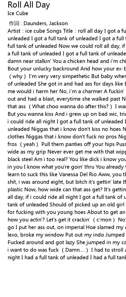 | [00:03.00] | Artist: ice cube Songs Title: roll all day I got a full tank of unleaded I got a full tank of unleaded I got a full tank of unleaded I got a full tank of unleaded Now we could roll all day, if i could ride all night I got a full tank of unleaded I got a full tank of unleaded I see you walkin' and i' m damn near stalkin' You a chicken head and i' m chicken hawkin', now we talkin' Bout your unlucky backround And how your exboyfriend is smokin' crack now why I' m very very simpethetic But baby where you headed? I got a full tank of unleaded She got in and had ass for days like Boom, Bam, God, Damn! She aks me would i harm her No, i' m a charmer A fuckin' night in shining armour We went out and had a blast, everytime she walked past Nigga got a quick fast glimpse of that ass What choo wanna do after this? I wanna get your tities in my fist But you wanna kiss And i grew up on bad wic, trick Now we could roll all day, if i could ride all night I got a full tank of unleaded I got a full tank of unleaded Niggas that i know don' t kiss no hoes Niggas that i know don' t buy no clothes Niggas that i know don' t fuck no pros Niggas that i know roll foots in fros yeah Pull them panties off your hips Pussy deep as crips And ' bout as wide as my grip Never ever get me with that wipper feel They got a pants full of black steel Am i too real? You like dick i know you do Wanna bring out the hoe in you I know what you' re goin' thru You already think you' re creol You should learn to suck this like Vanessa Del Rio Aww, you thought i was a nice guy But shit, i was around eight, but bitch it' s gettin' late If i wrap my dick in plastic Now, how wide can that ass get? It' s gettin' drastic Now we could roll all day, if i could ride all night I got a full tank of unleaded I got a full tank of unleaded Should of picked up an old girl that i know That' s what i get for fucking with you young hoes About to get an attitude, what' s hapenin'? Baby how you actin'? Let' s get it crackin' c' mon No? Well then bitch you got to go I put her ass out, on imperial Hoe slamed my door, next to texico Kick my lexo, broke my window Put out my indo Jumped out and said bitch are you crazy? Fucked around and got lazy She jumped in my car, took off, now i' m stuck And all i want to do was fuck Damn.... I had to stroll all day, I had to walk all night I had a full tank of unleaded I had a full tank of unleaded |