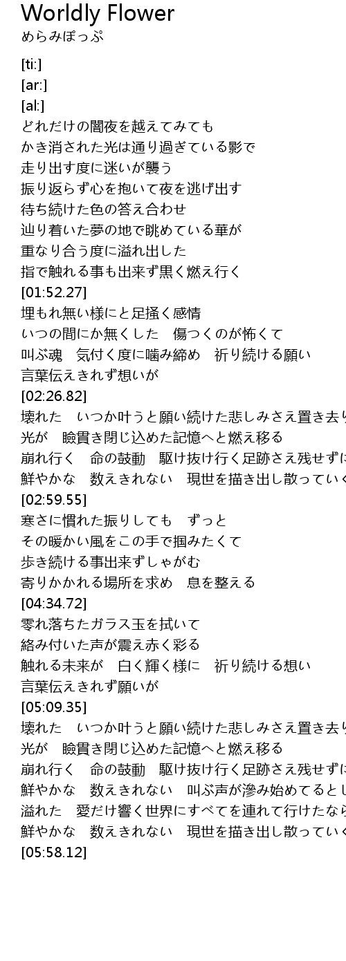 | [05:47.02] | 鮮やかな 数えきれない 現世を描き出し散っていく華 |