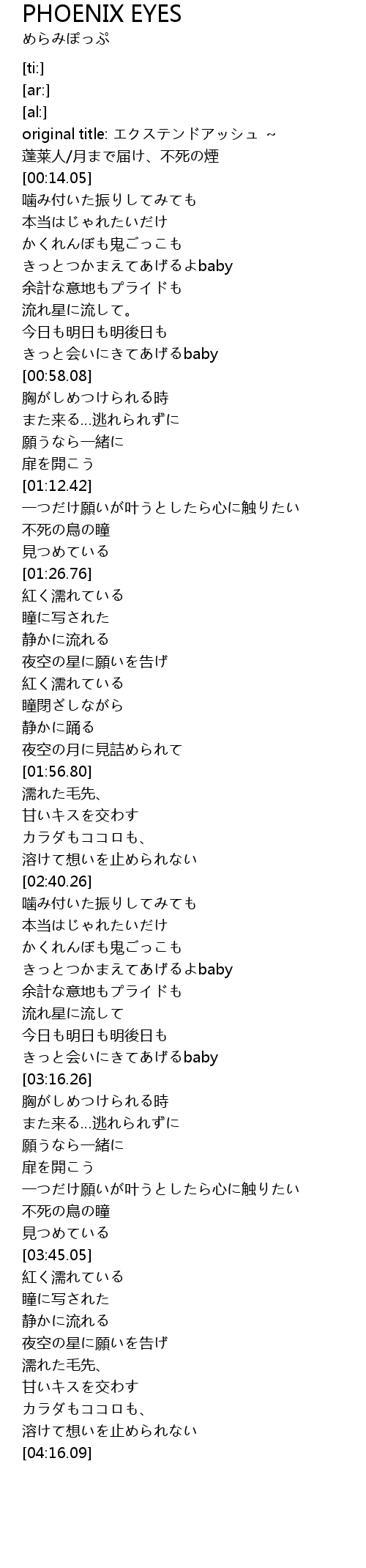 | [00:04.23] | original title: エクステンドアッシュ ~ 蓬莱人/月まで届け、不死の煙 |