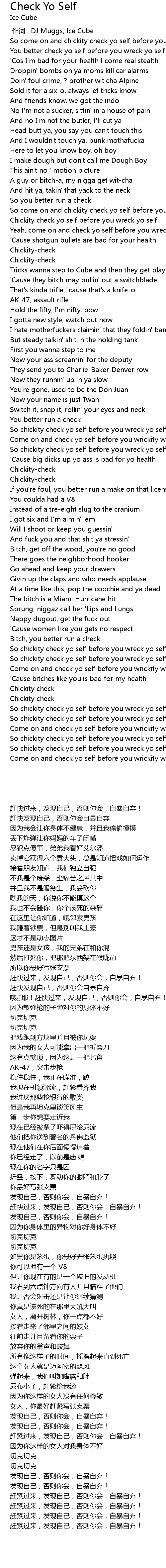 | [01:03.69] | Chickity check yo self before you wreck yo self |