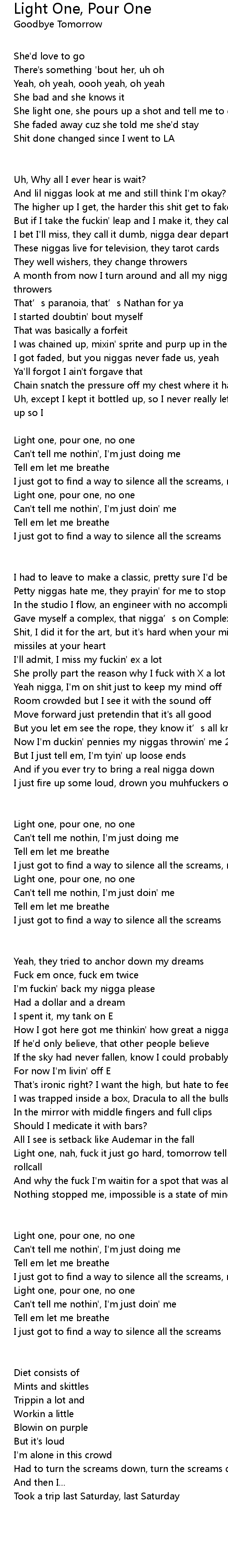 | [01:23.30] | I just got to find a way to silence all the screams, nigga |