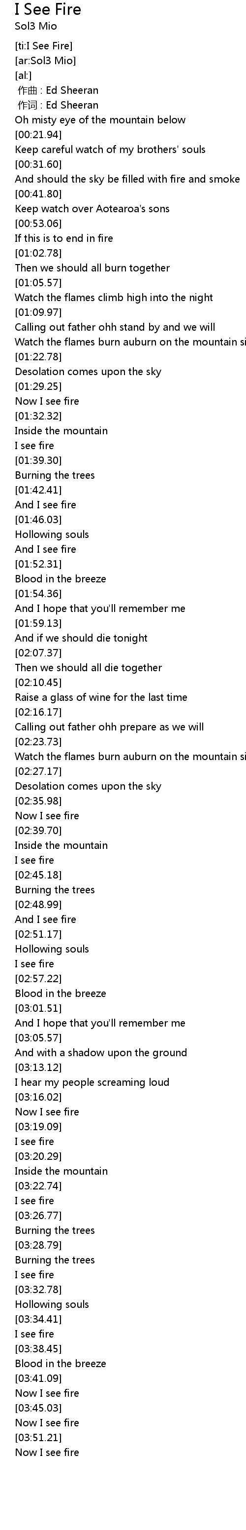 | [02:24.63] | Watch the flames burn auburn on the mountain side |
