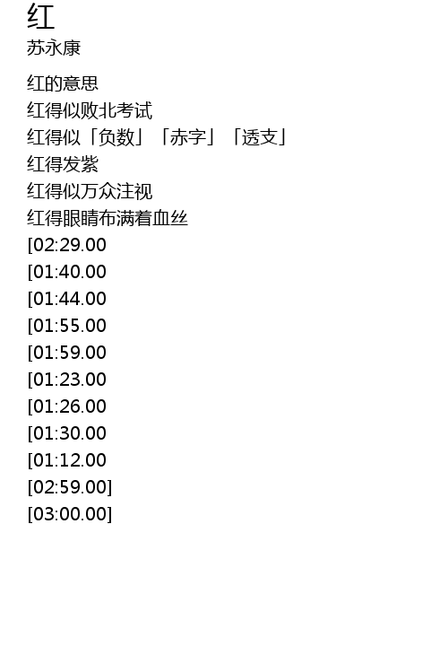 | [02:22.00][01:30.00] | 红得似命案印在报纸 |