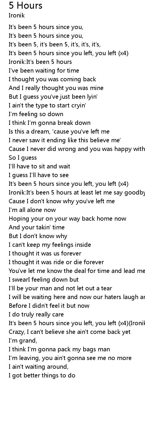It's been 5 hours since you left, you left (x4)(Ironik speaking) |