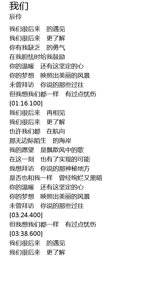 | [00:19.620] | wǒ men hěn hòu lái de yù jiàn |