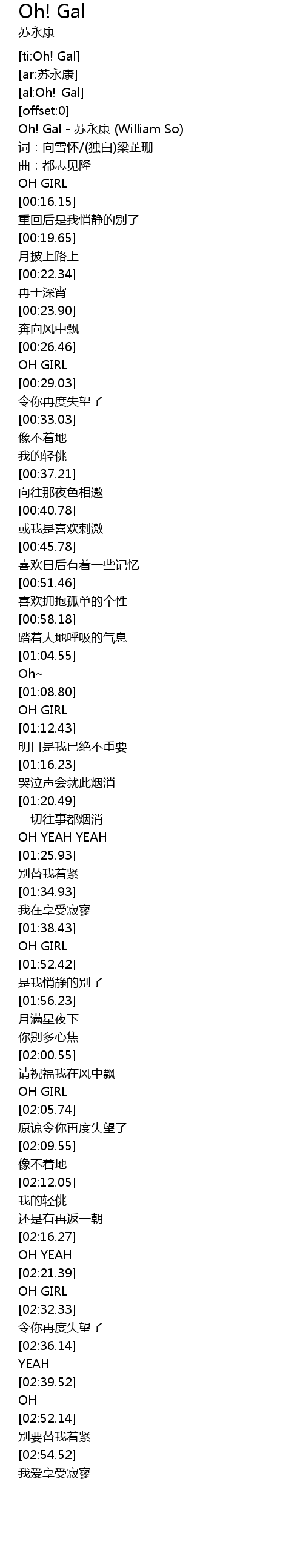| [00:00.00] | Oh! Gal - 苏永康 (William So) |