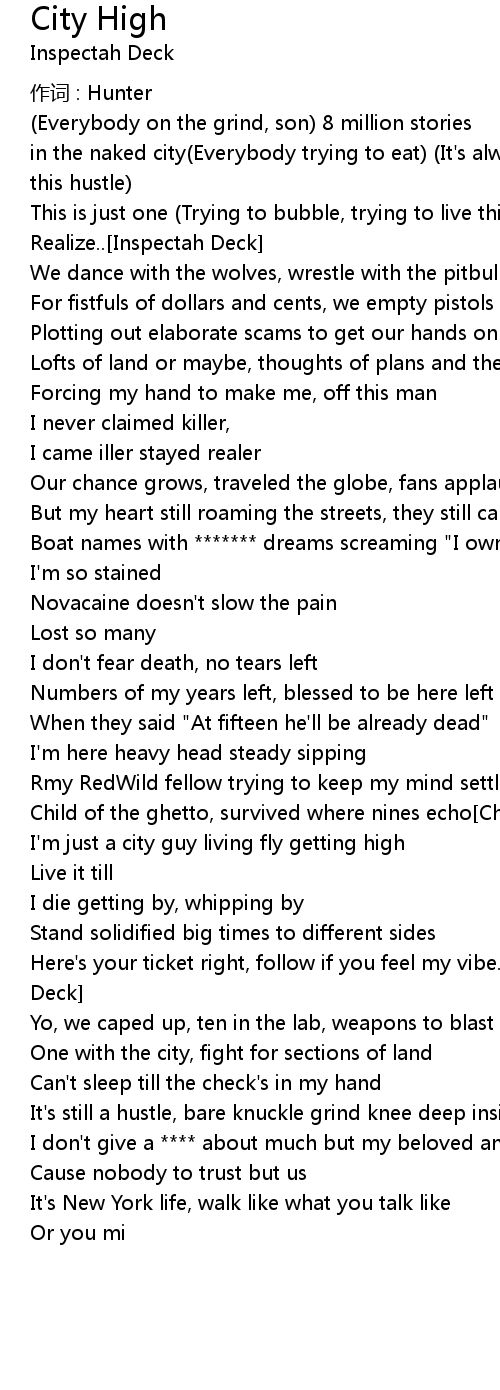 | Intro: Inspectah Deck sample Everybody on the grind, son 8 million stories in the naked city Everybody trying to eat It' s always gonna be a struggle, in this hustle | |