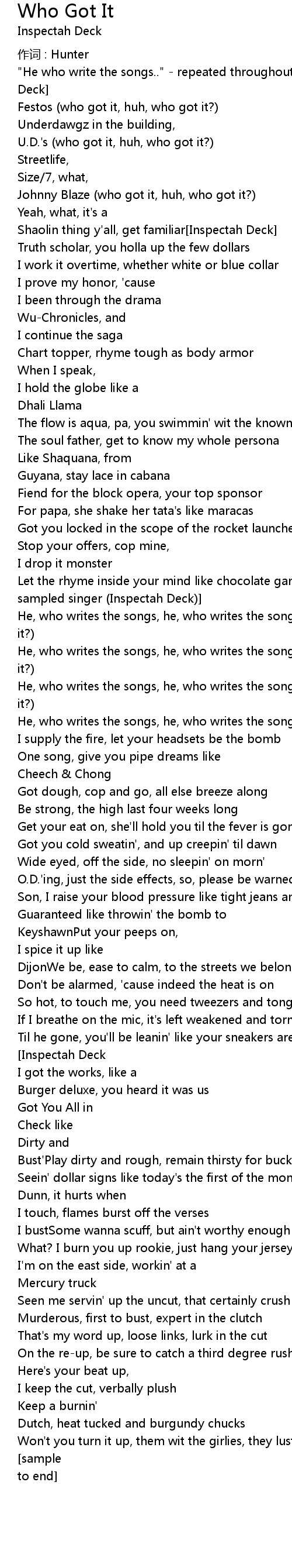 | "He who write the songs.." - repeated throughout the intro[Intro: Inspectah Deck] | |