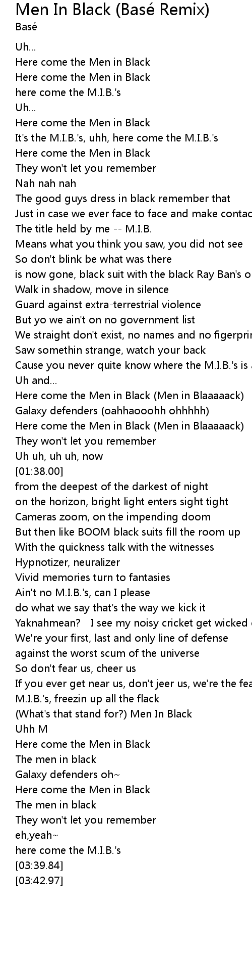 | [01:20.02] | Here come the Men in Black Men in Blaaaaack |