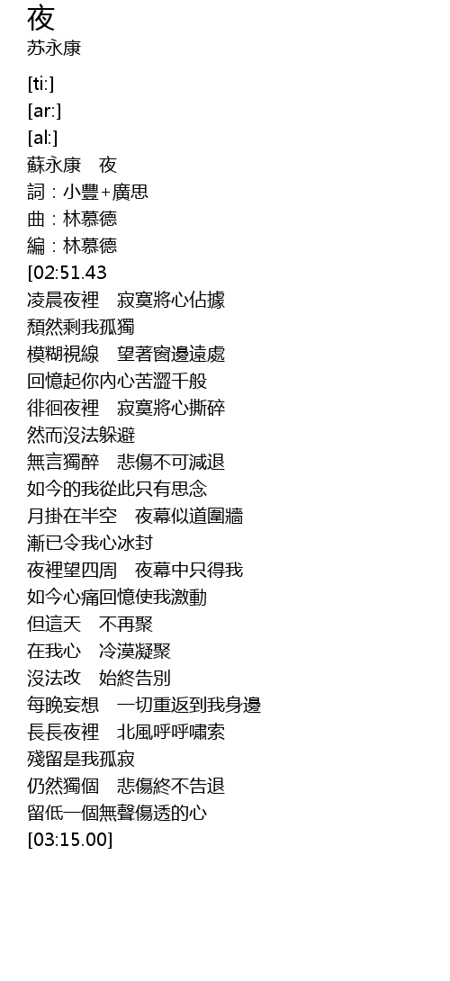 | [00:59.39] | 徘徊夜裡 寂寞將心撕碎 |