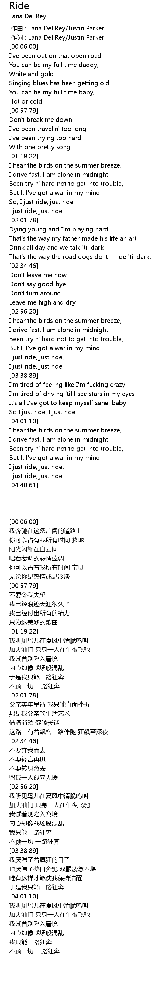 | [00:01.00] | 作词 : Lana Del Rey/Justin Parker |