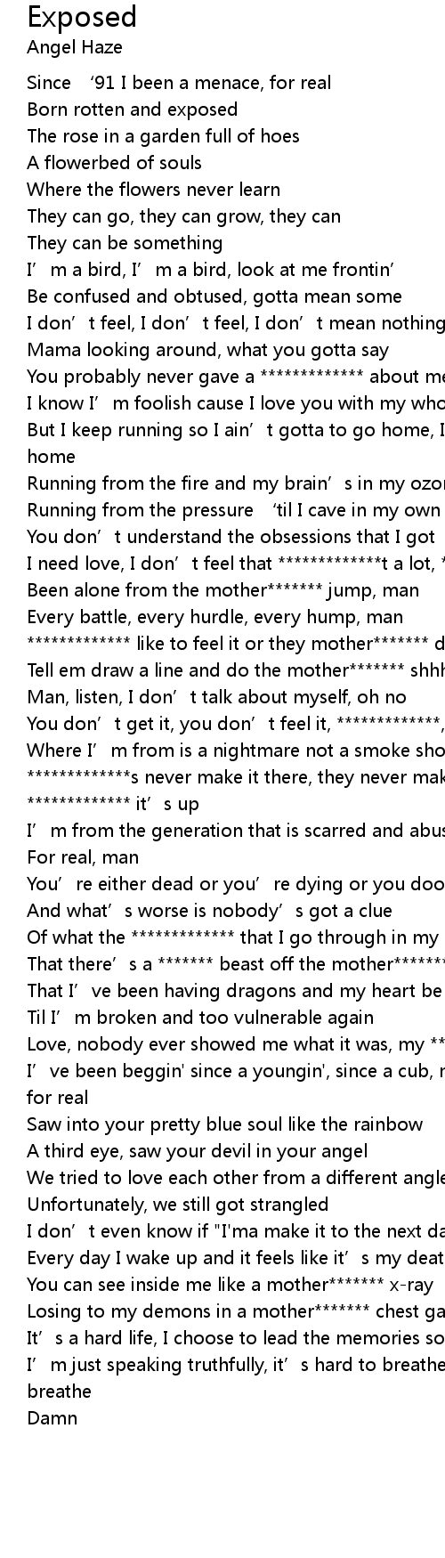 | [02:13.30] | I’ve been beggin' since a youngin', since a cub, my *************, for real |