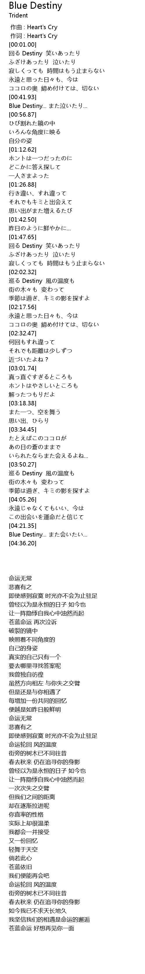 | [00:43.33] | Blue Destiny... また泣いたり... |