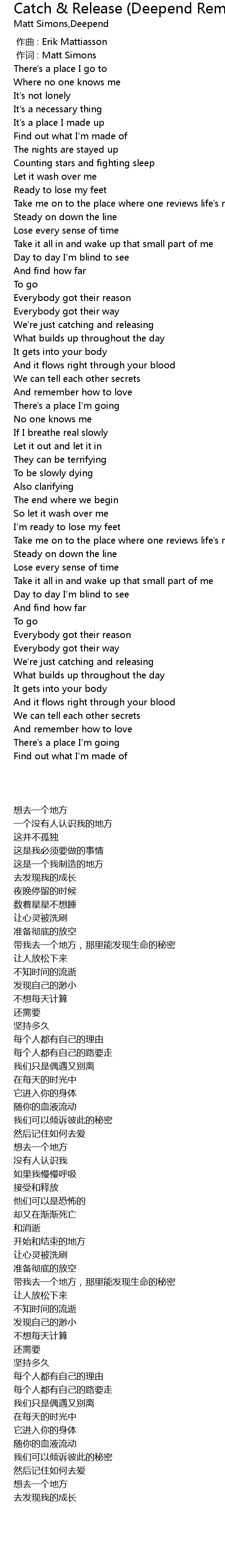 | [00:01.00] | 作词 : Matt Simons |