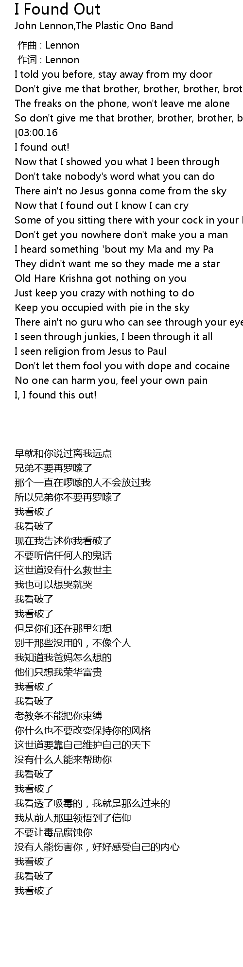 | [03:10.88][03:00.16][02:33.80][02:28.52][01:38.08][01:32.65][01:05.81][01:00.47][00:33.64][00:28.10] | I, I found out! |