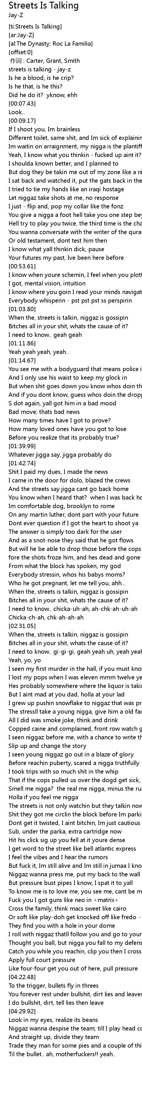 | [02:32.67] | When the, streets is talkin, niggaz is gossipin |
