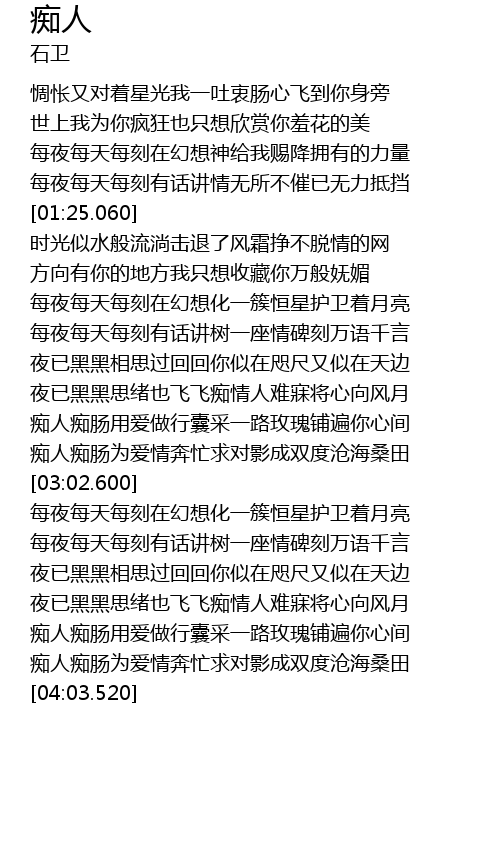 | [03:44.480] | 痴人痴肠用爱做行囊采一路玫瑰铺遍你心间 |