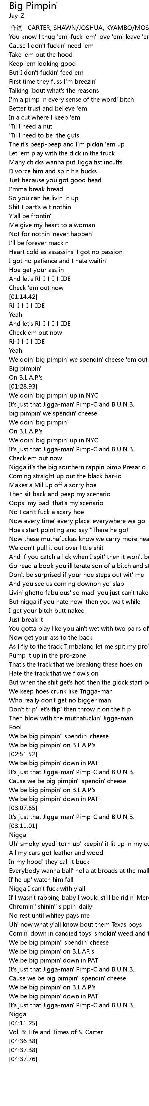 | [02:57.43] | It' s just that Jiggaman' PimpC and B. U. N. B. |