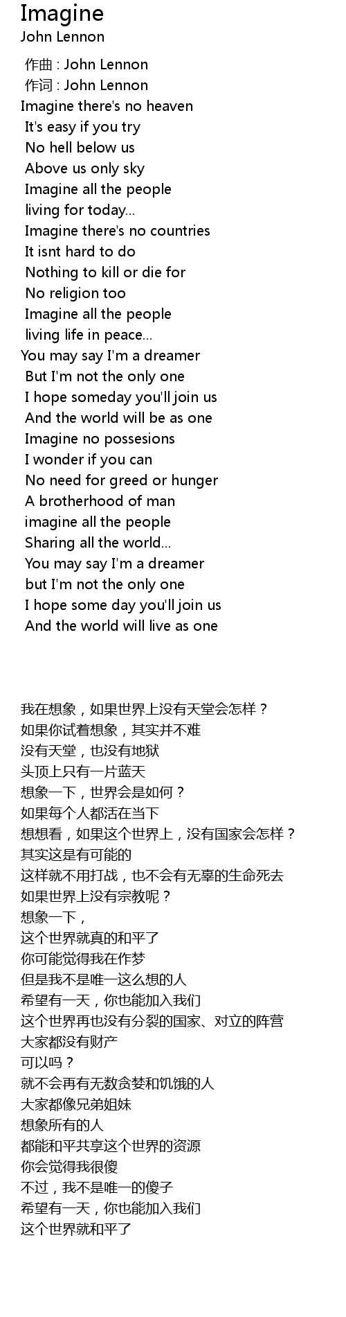 | [00:13.809] | 我在想象,如果世界上没有天堂会怎样? |